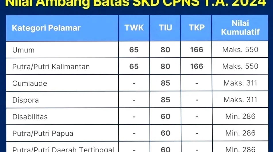 Para peserta seleksi Calon Pegawai Negeri Sipil (CPNS) pada tahun 2024 kini telah menyelesaikan rangkaian tes Seleksi Kompetensi Dasar (SKD) yang dilaksanakan sejak 16 Oktober hingga 14 November 2024. Pelaksanaan SKD sendiri menggunakan mekanisme sistem Computer Assisted Test (CAT) sesuai dengan Peraturan BKN Nomor 5 Tahun 2024 tentang Prosedur