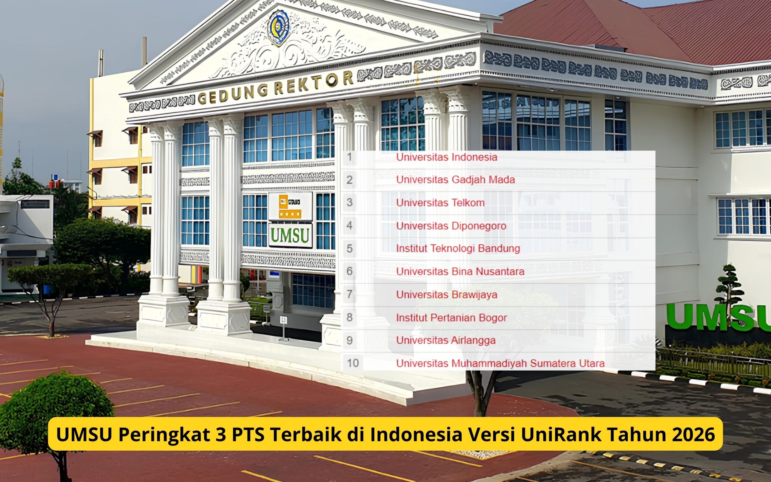 Alhamdulillah, UMSU berhasil meraih peringkat 3 sebagai PTS terbaik di Indonesia versi UniRank 2026. Pencapaian ini menjadi kebanggaan bagi Universitas Muhammadiyah Sumatera Utara (UMSU) sekaligus seluruh sivitas akademika. UMSU juga sukses menembus 10 besar universitas terbaik di Indonesia dari total 611 perguruan tinggi yang dinilai oleh UniRank.