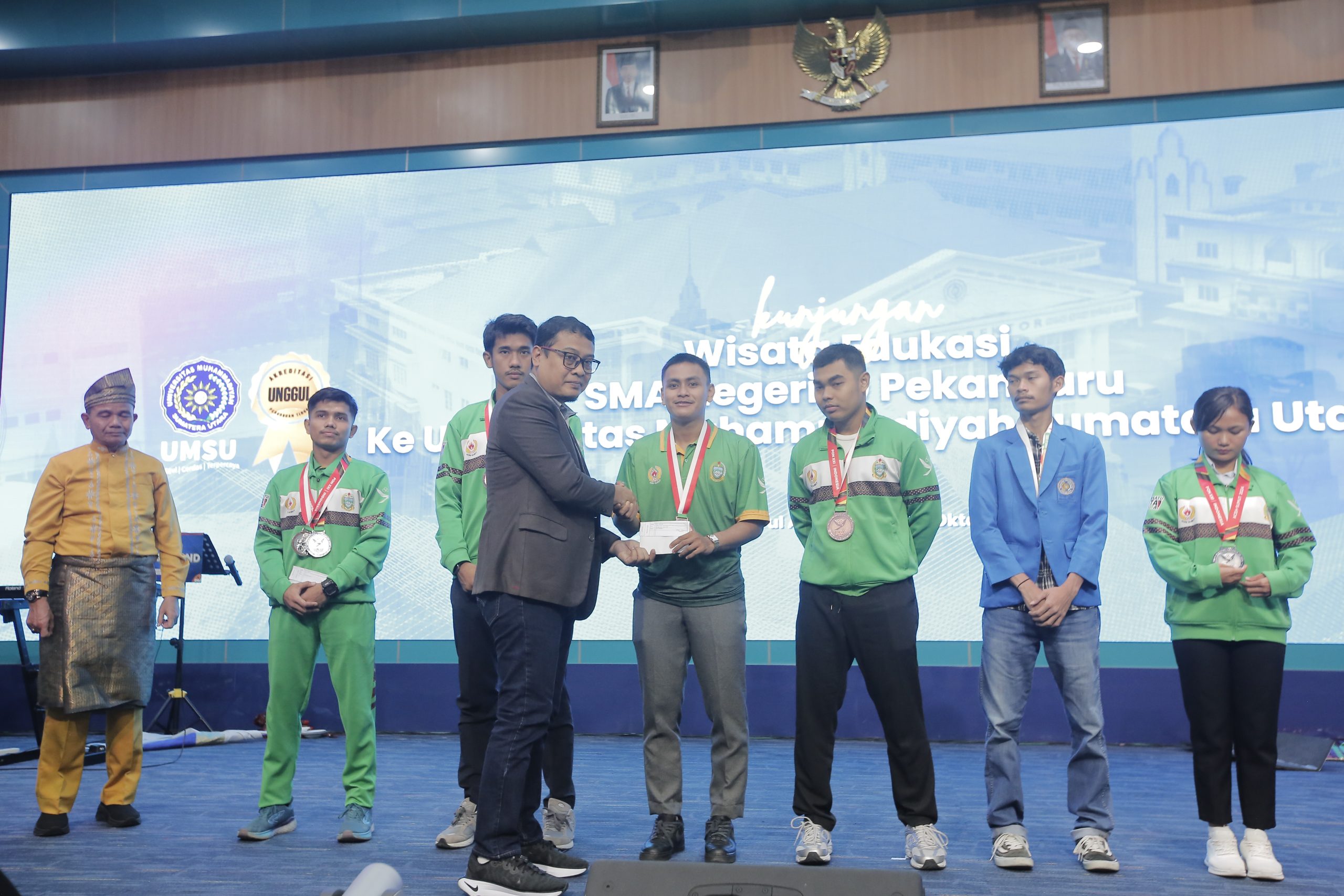 Rektor UMSU Prof. Dr. Agussani, MAP diwakili WR 1 Prof. Dr. Muhammad Arifin, M.Hum dan WR 3 Dr. Rudianto, M.Si menyerahkan tali asih kepada 6 mahasiswa atlet UMSU yang berhasil meraih mendali di ajang Pekan Olahraga Nasional (PON) Aceh-Sumut 2024. Penyerahan dilakukan pada, Senin (14/10) di Auditorium UMSU Jalan Muchtar Basri No.3 Medan di sela acara kunjungan SMA N 10 Pekanbaru.