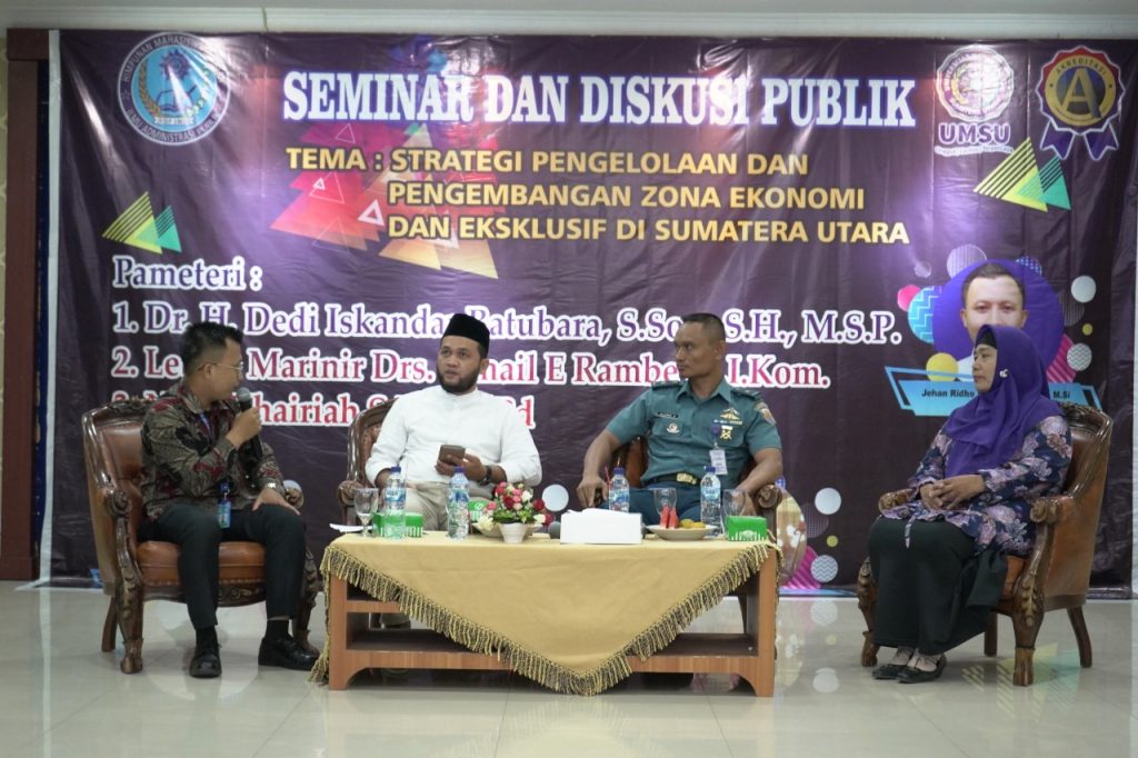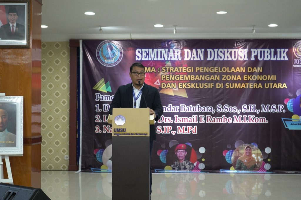 Mahasiswa Jurusan Ilmu Administrasi Publik (HMJ IAP) Fakultas Ilmu Sosial dan Ilmu Politik Universitas Muhammadiyah Sumatera Utara (FISIP UMSU) menggelar seminar dan diskusi publik bertema strategi pengelolaan dan pengembangan zona ekonomi eksklusif (ZEE) di Sumatera, di Auditorium Kampus UMSU, Jalan Mukhtar Basri Kota Medan, Kamis (12/3/2020).