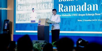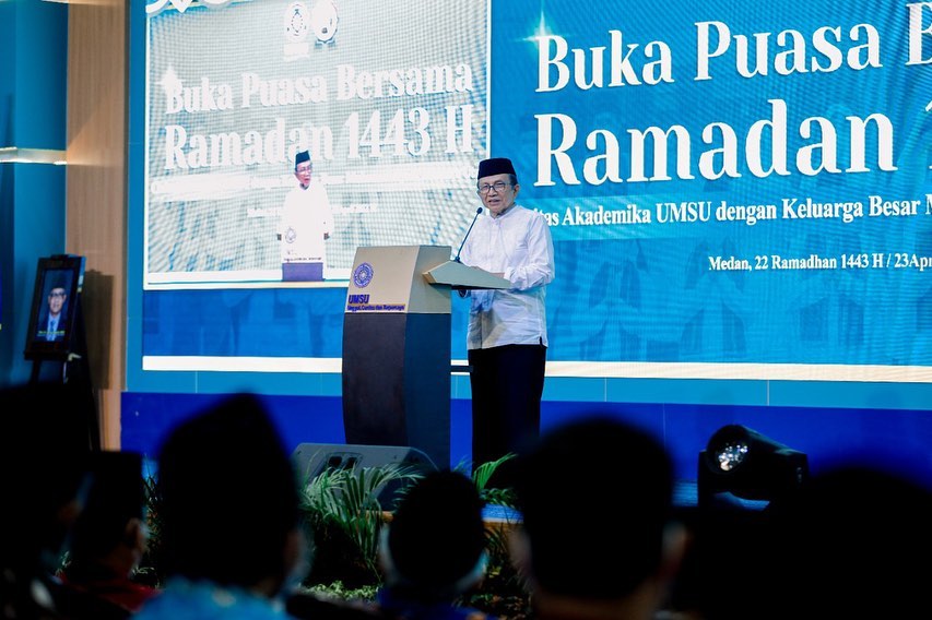 Chairman of PP Muhammadiyah Dahlan Rais M.Hum was present in front of nearly 800 UMSU academics and North Sumatra Muhammadiyah residents at a friendly breaking fast at the UMSU Campus Jalan Muhtar Basri Medan, Saturday (23/4).