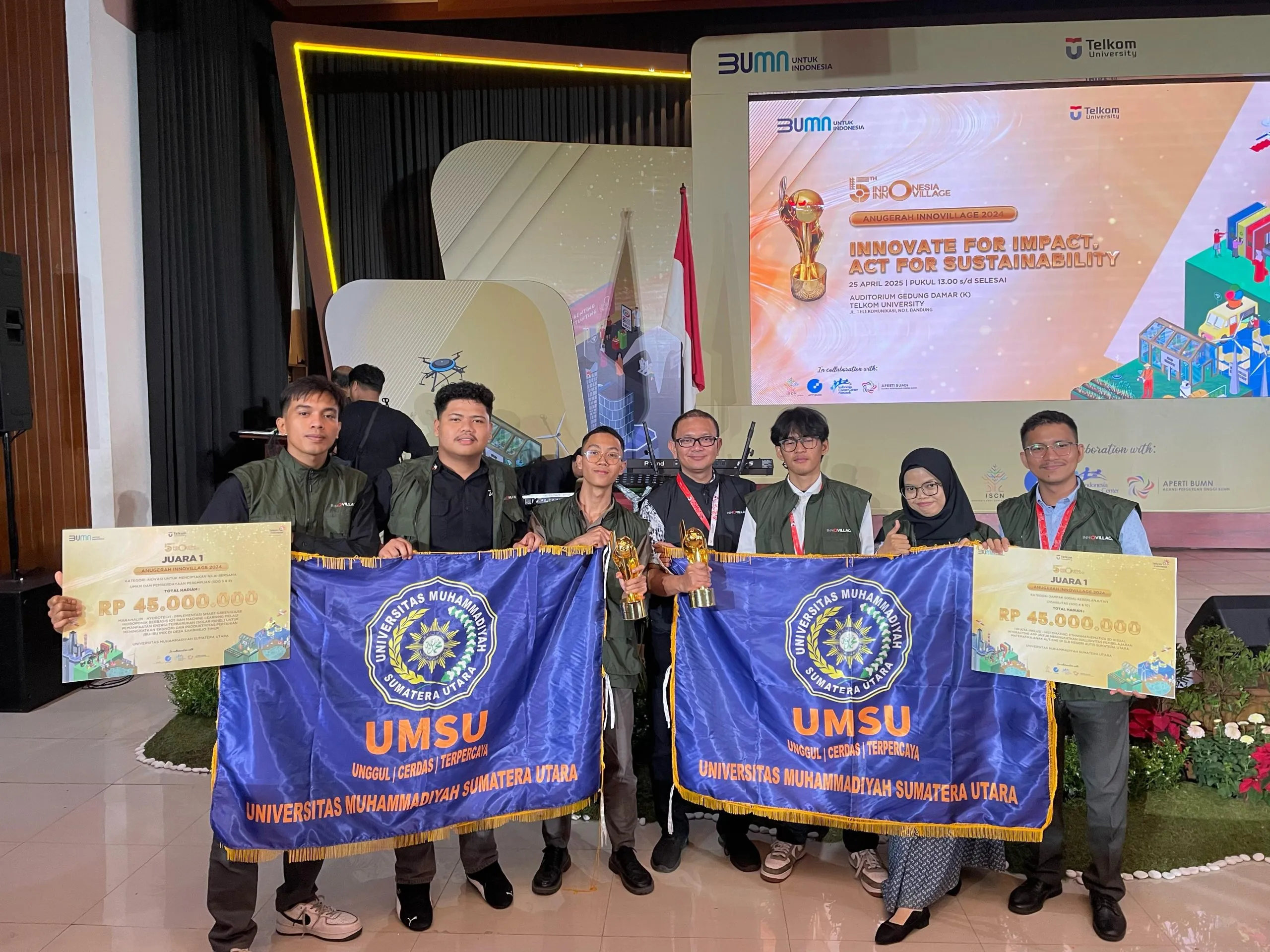 Universitas Muhammadiyah Sumatera Utara (UMSU) once again achieved outstanding recognition by securing two top awards—first place—in the prestigious Innovillage 2024: Innovate for Impact, Act for Sustainability, held on Friday (April 25) at the Damar (K) Auditorium, Telkom University, Bandung.