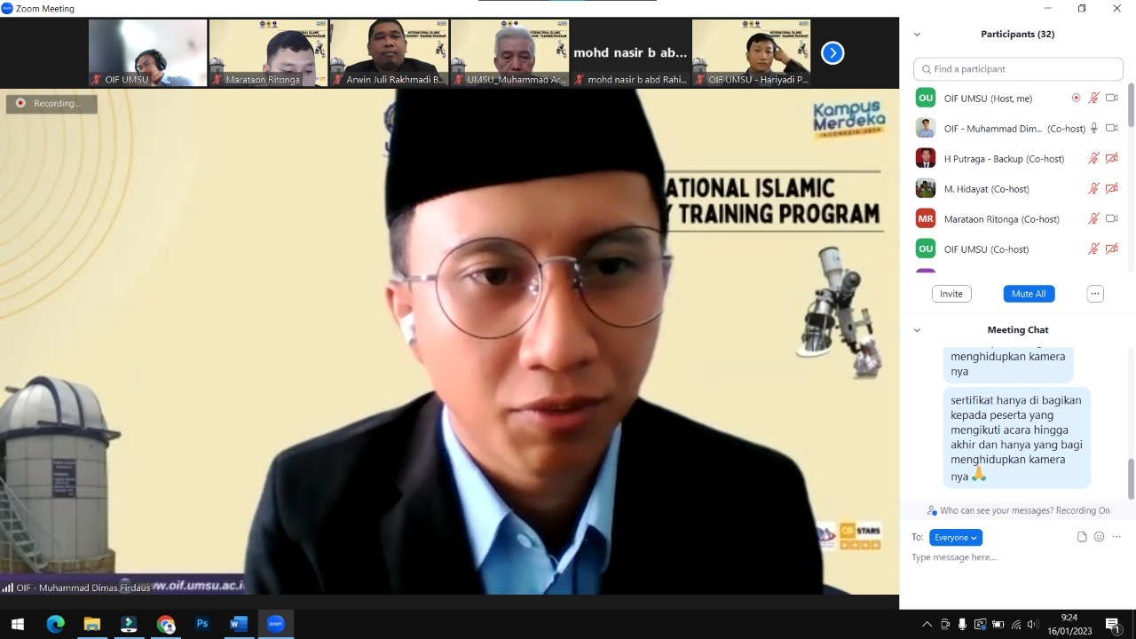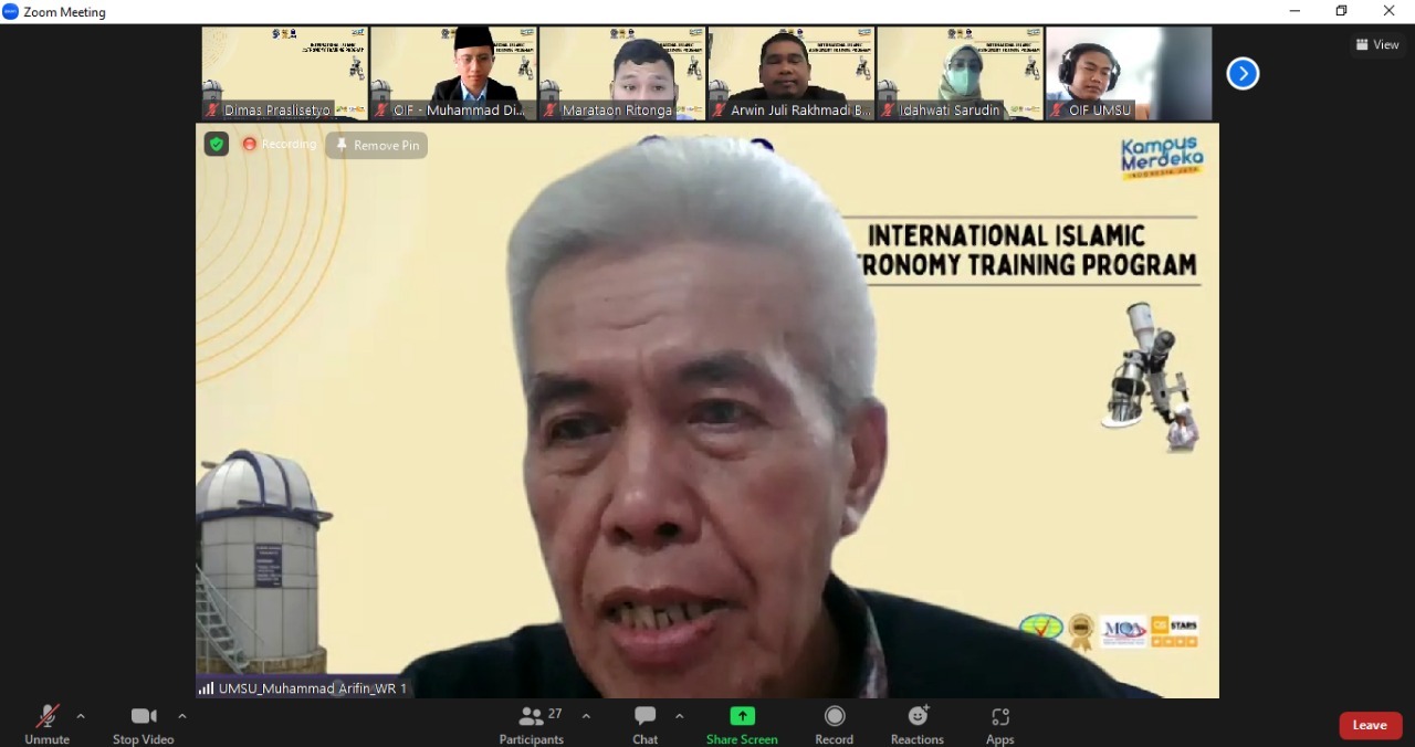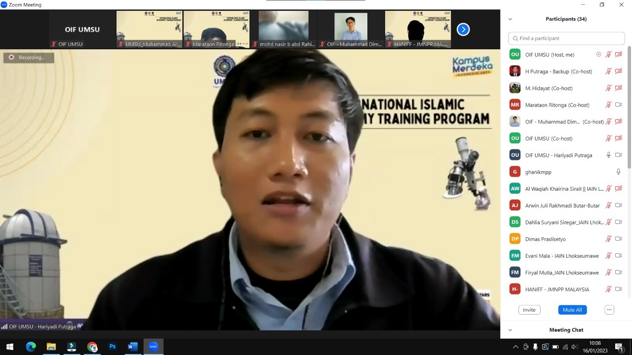 Observatorium Ilmu Falak Universitas Muhammadiyah Sumatera Utara (OIF UMSU) menyelenggarakan “International Islamic Astronomy Training Program” yang dilaksanakan pada Senin 16 Januari 2023 via zoom.