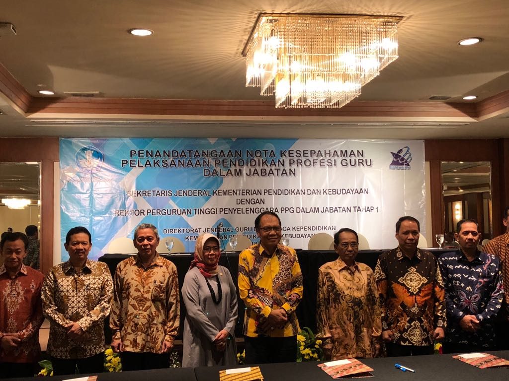 Rektor UMSU Dr Agussani, MAP salah satu pimpinan universitas se-Indonesia yang menandatangani Nota Kesepahaman (MoU) Penyelenggaraan Profesi Guru (PPG) dalam Jabatan tahun 2018 dengan pemerintah di Jakarta, Selasa (29/5).