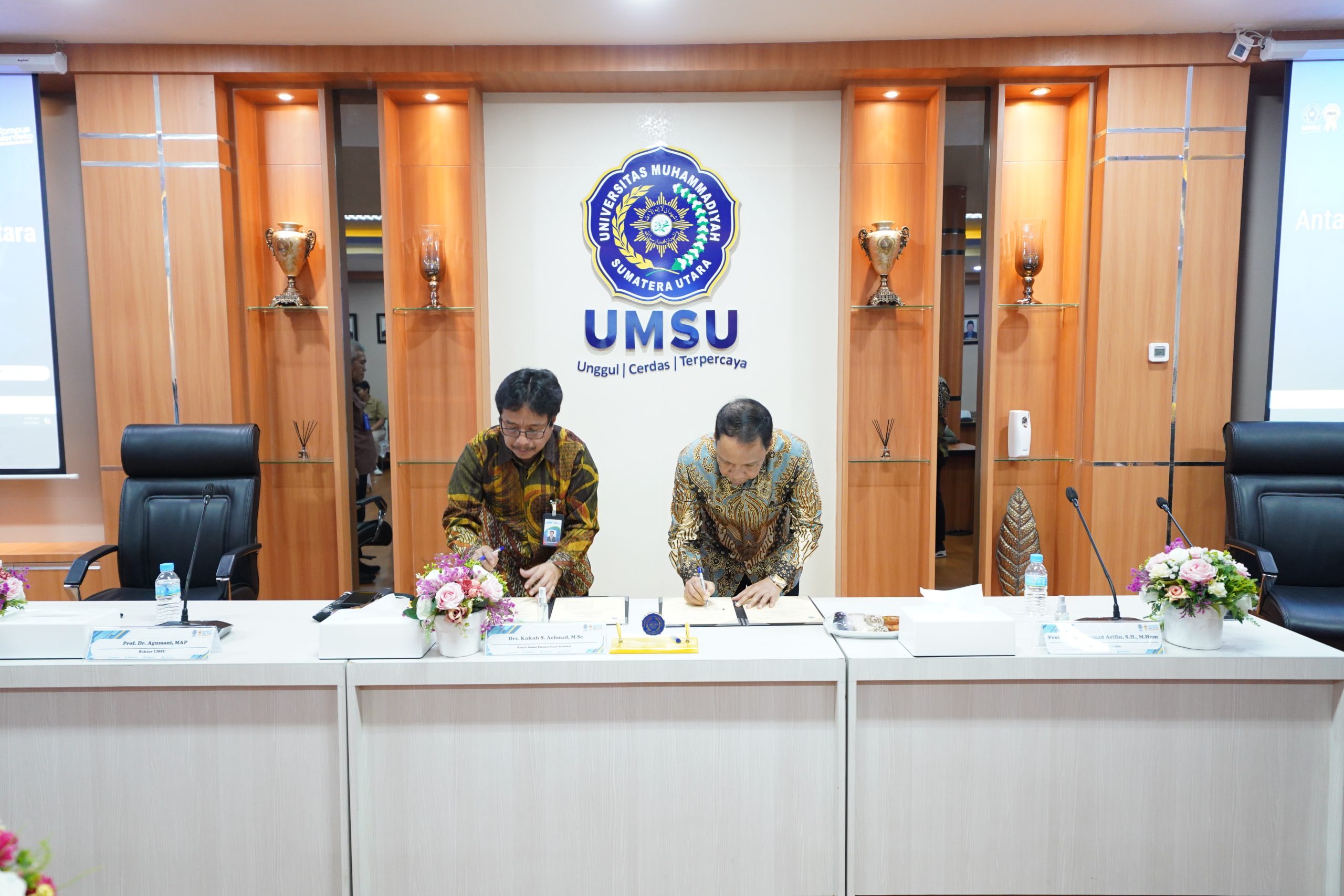 Rektor UMSU Prof. Dr. Agussani, MAP dan Kepala Badan Standardisasi Nasional (BSN) Drs. Kukuh S. Achmad, M.Sc tandatangani Memorandum of Understanding (MoU), jalin kolaborasi terkait Tri Dharma Perguruan Tinggi dan resource sharing, Kamis (22/2) di Ruang Rapat UMSU Jalan Muchtar Basri No.3 Medan.