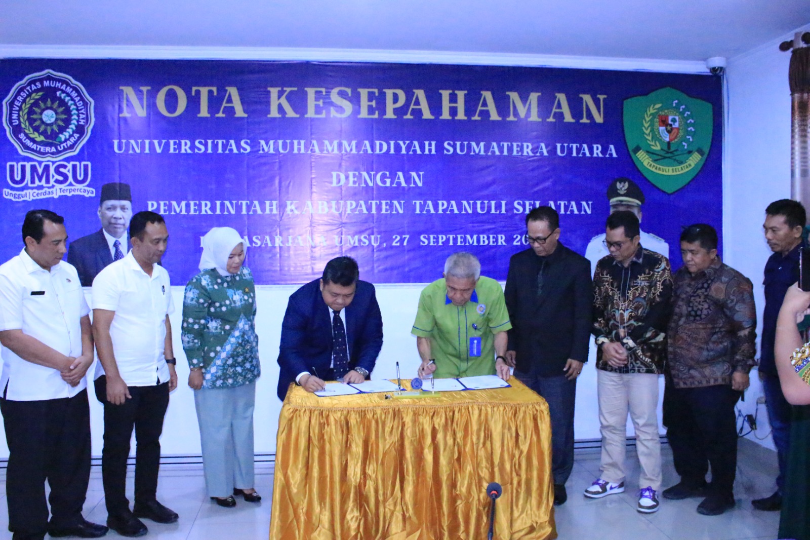 Penandatangan MoU yang dilakukan Rektor UMSU yang diwakili WR I Prof Dr Muhammad Arifin SH MHum dan Bupati Tapsel Dolly Putra Parlindungan Pasaribu SPt MM.ini dilaksanakan di Aula Pacsarjana UMSU, Jl. Denai 217 Medan, Rabu (27/9/2022).