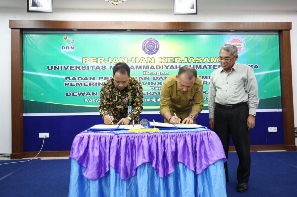 Komitmen kerjasama ini dikukuhkan melalui penandatangan Memorandum of Understanding (MoU) oleh Rektor UMSU Dr Agussani MAP, Kepala Balitbang Sumut Dr Ir HMA Effendy Pohan MSi dan Ketua DRD Sumut Prof. Dr. Harmein Nasution MSIE PhD. Penandatangan MoU digelar di Ruang Aula Pascasarjana UMSU Jl Denai No 217 Medan, Selasa (14/8/2018).