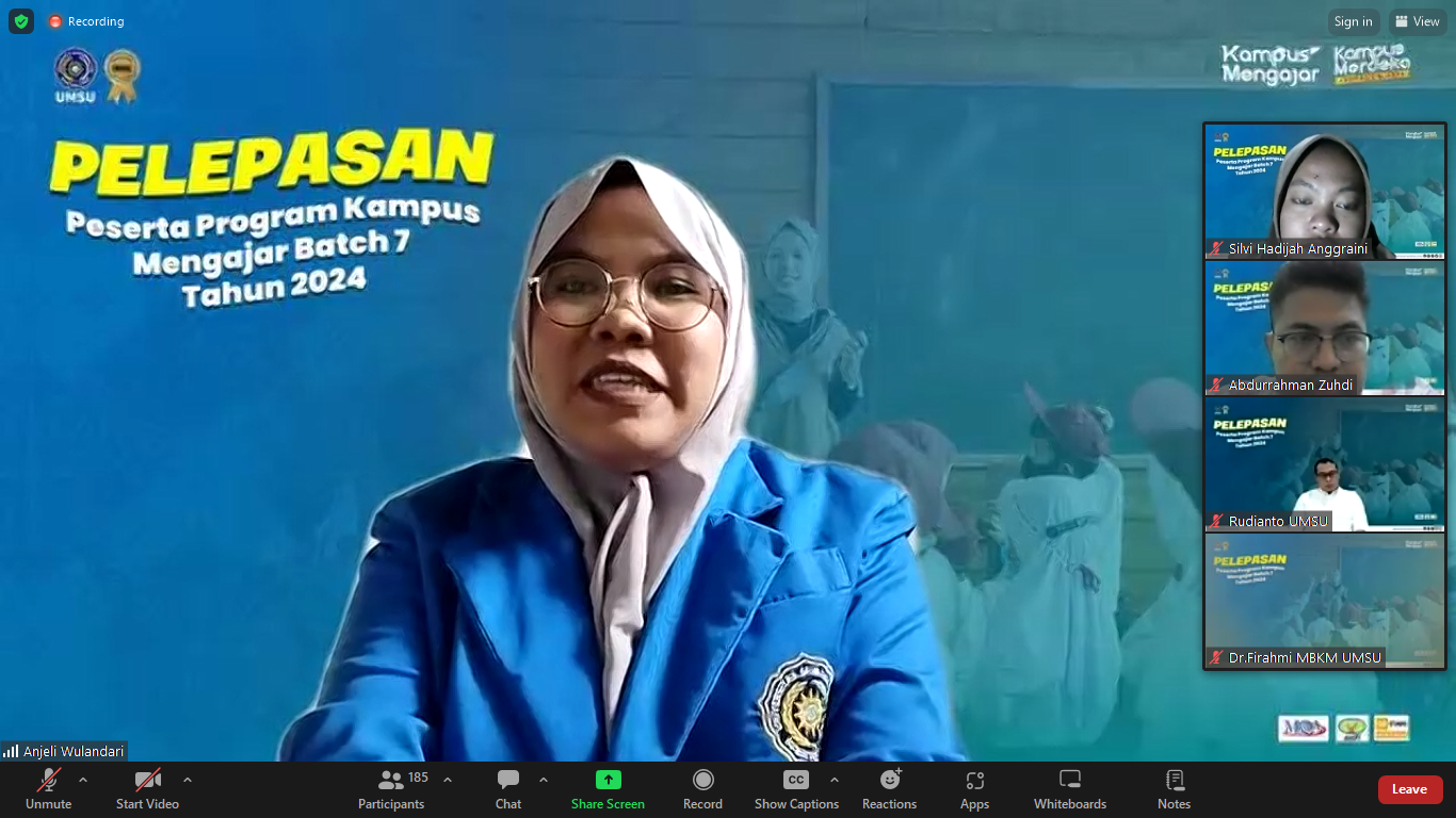 Pada kesempatan ini, Anjeli Wulandari dari Fakultas Hukum mewakili peserta KM Batch 7 mengucapakan terima kasih karena UMSU sangat memfasilitasi program-program MBKM.
