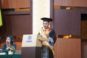 Sementara perwakilan lulusan berprestasi, Yudi Febrianto Samosir, menyampaikan kisah inspiratifnya sebagai mahasiswa non-muslim di UMSU. Yudi yang aktif be
